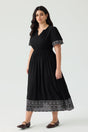 Embrace your curves in this black plus size dress that combines elegance and comfort for every body type. Designed with a loose, flowy silhouette and relaxed fit, this midi dress features a classic V-neck and short sleeves adorned with delicate white floral embroidered trim—adding a bohemian touch to your everyday look.