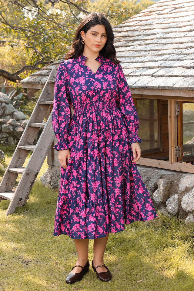 The elegant Floral Print Tiered Mididress features a flattering V-neckline and a smocked, elasticated waist that cinches the silhouette beautifully. The midi length and tiered skirt create a graceful, flowing look, perfect for any occasion. The vibrant floral pattern is available in two stunning color combinations: a rich navy blue with bright fuchsia flowers, and a chic white and blue abstract floral print.